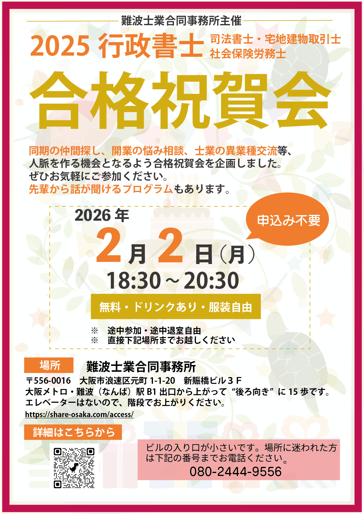 - 【1/24】行政書士受験生交流会、【2/3】合格祝賀会を開催!【1/24】行政書士受験生の交流会【無料】 行政書士試験の受験生のための、情報収集やモチベーションアップを目的とした交流会です。昨年の試験合格者も参加します。 詳細はこちら 【2/3】2024行政書士合格祝賀会【無料】 […]
